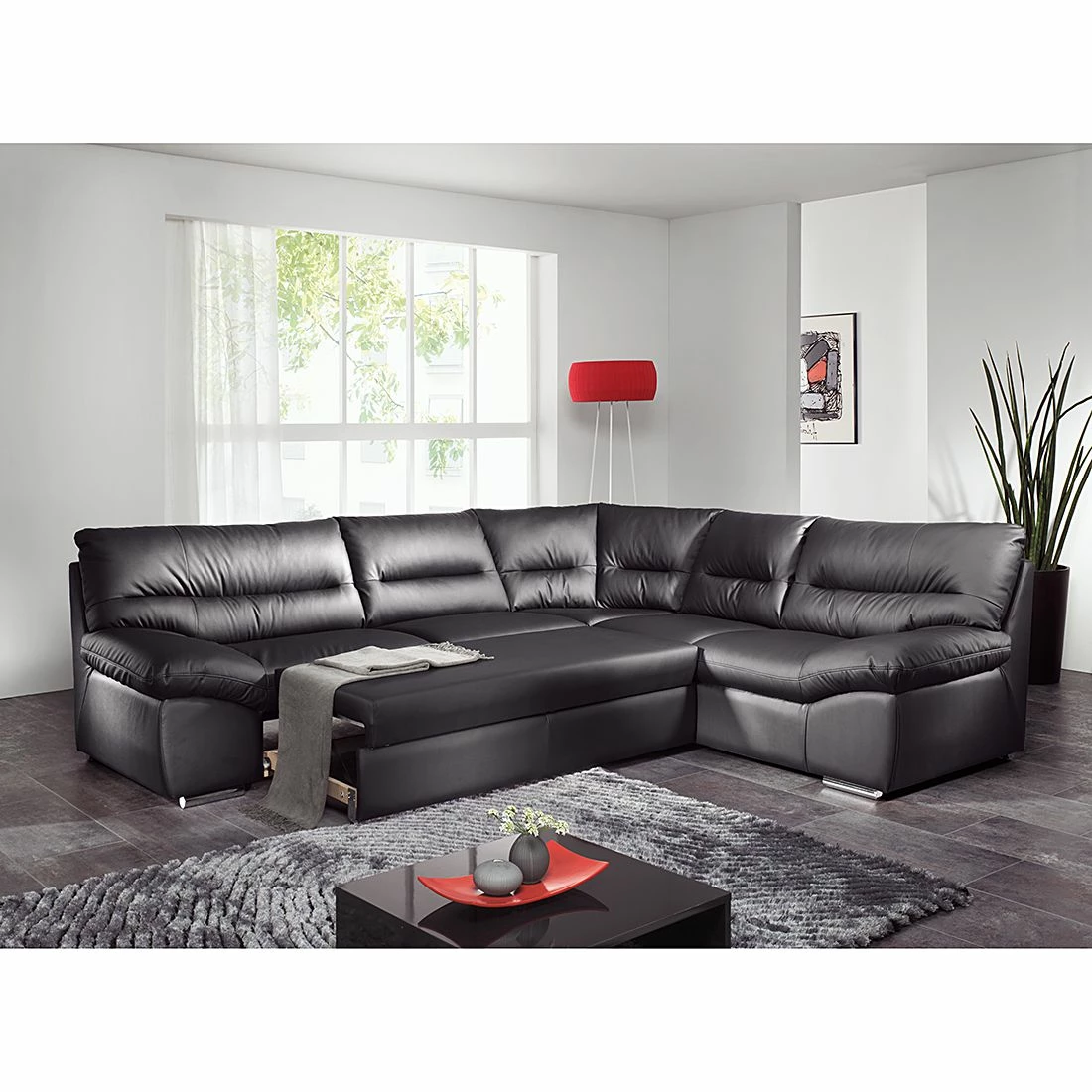 Dieses schwarze Sofa mit Schlaffunktion von Cotta aus der Serie Howard ist genau das Richtige, wenn Sie ein klassisch-modernes Design bevorzugen. Hergestellt ist es aus Kunstleder. Das praktische Kunstleder hat folgenden Vorteil: Es bleibt lange schön. Garantiert komfortabel sitzen Sie durch die weiche Wellenunterfederung ebenfalls. Besonders praktisch ist die Schlaffunktion, dank der Sie das Ecksofa mit nur wenigen Handgriffen in ein Bett verwandeln.
