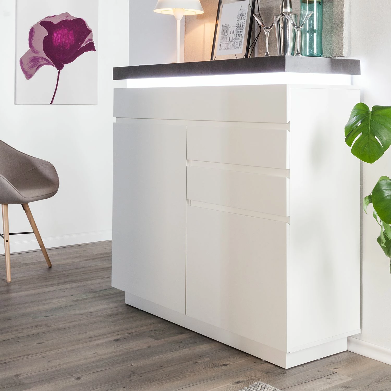 - Lieferumfang: Kommode inkl. Beleuchtung ohne Dekoration