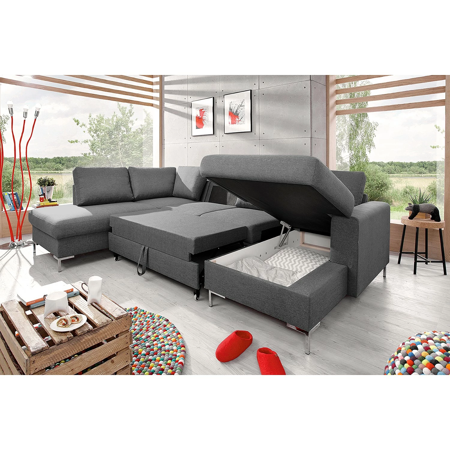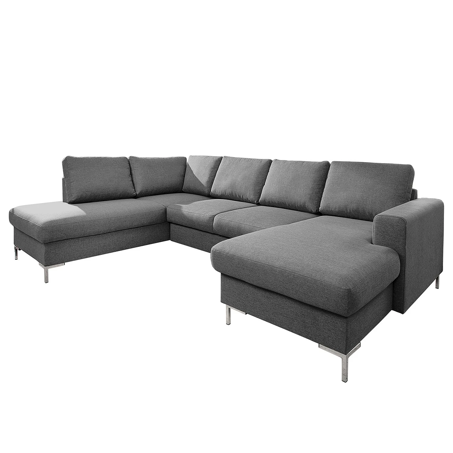 Fredriks Wohnlandschaft Sagata – Webstoff – Grau – Ottomane davorstehend links – Bettkasten – Schlaffunktion für dauerhafte Nutzung