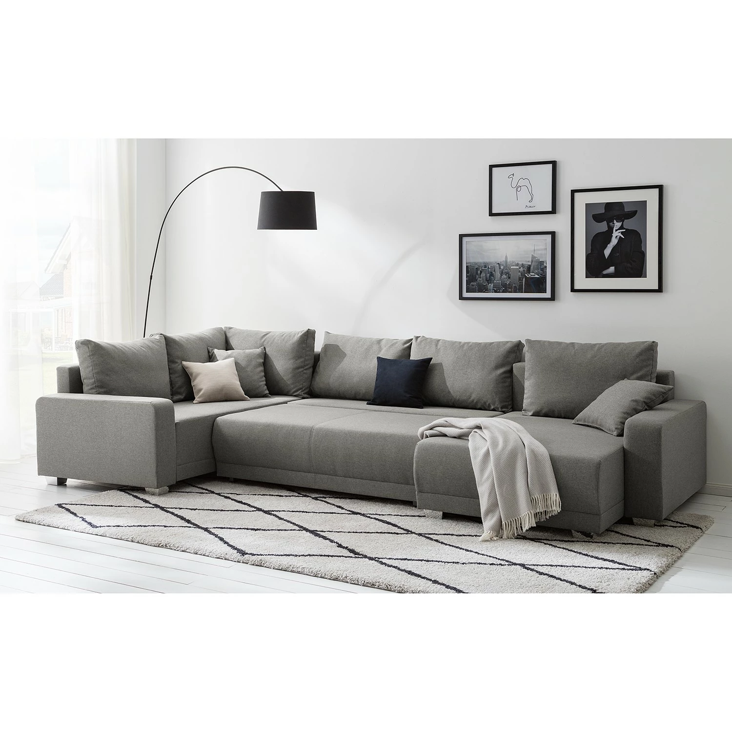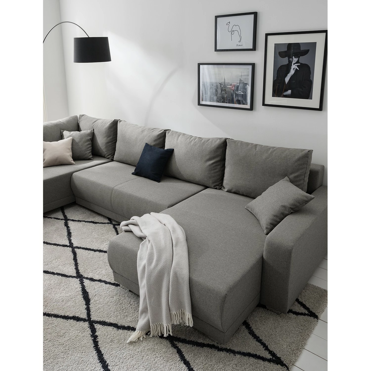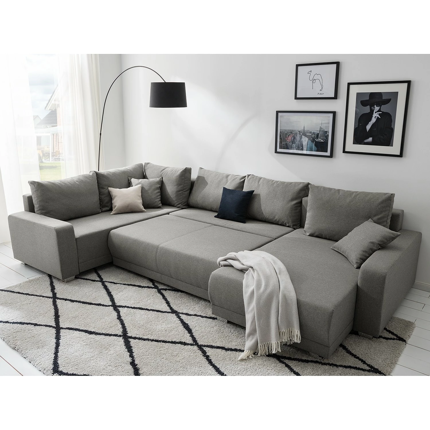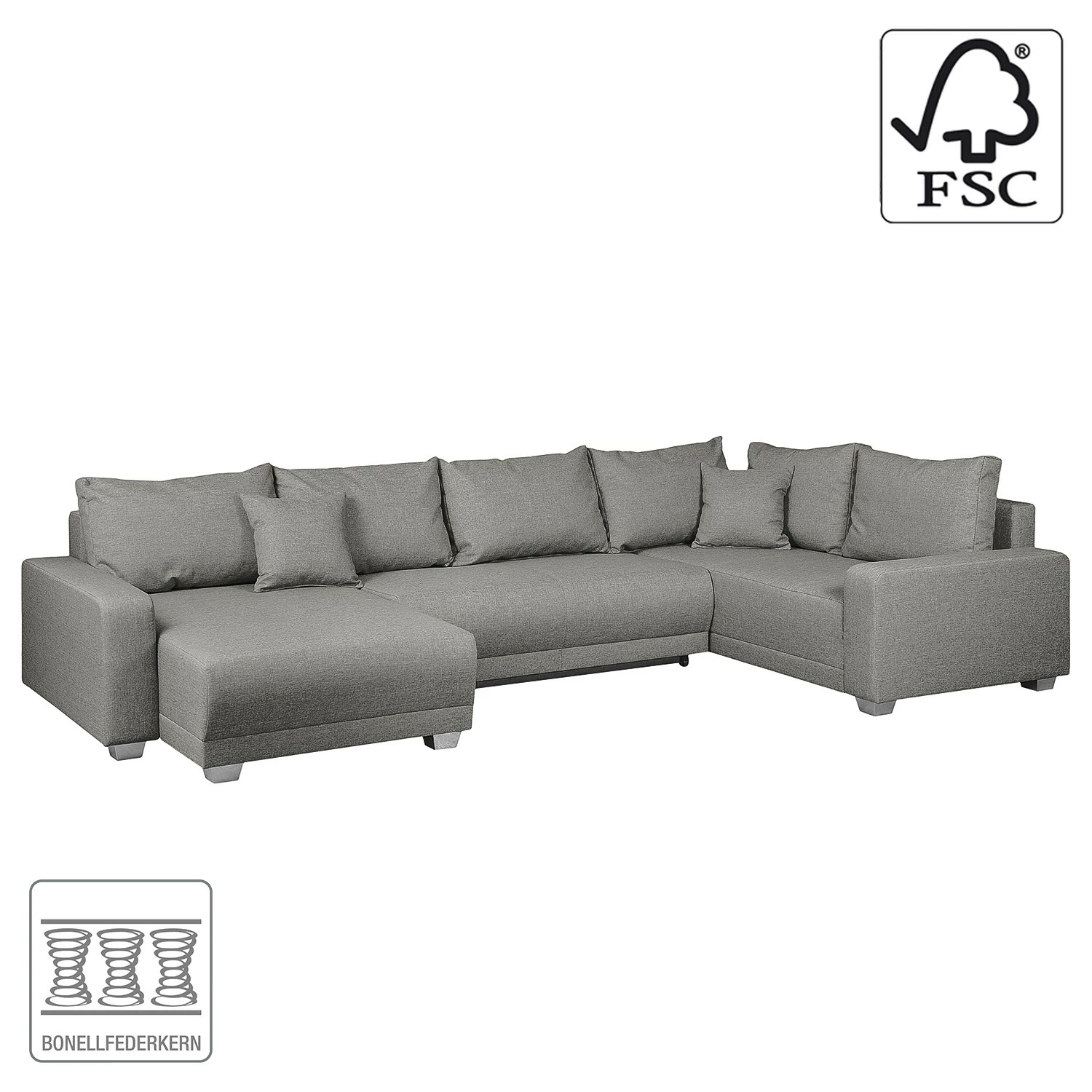 - Lieferumfang: Wohnlandschaft inkl. 6 Rücken- und 2 Zierkissen, ohne Dekoration