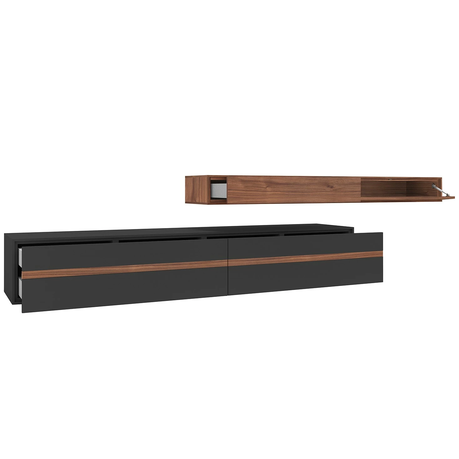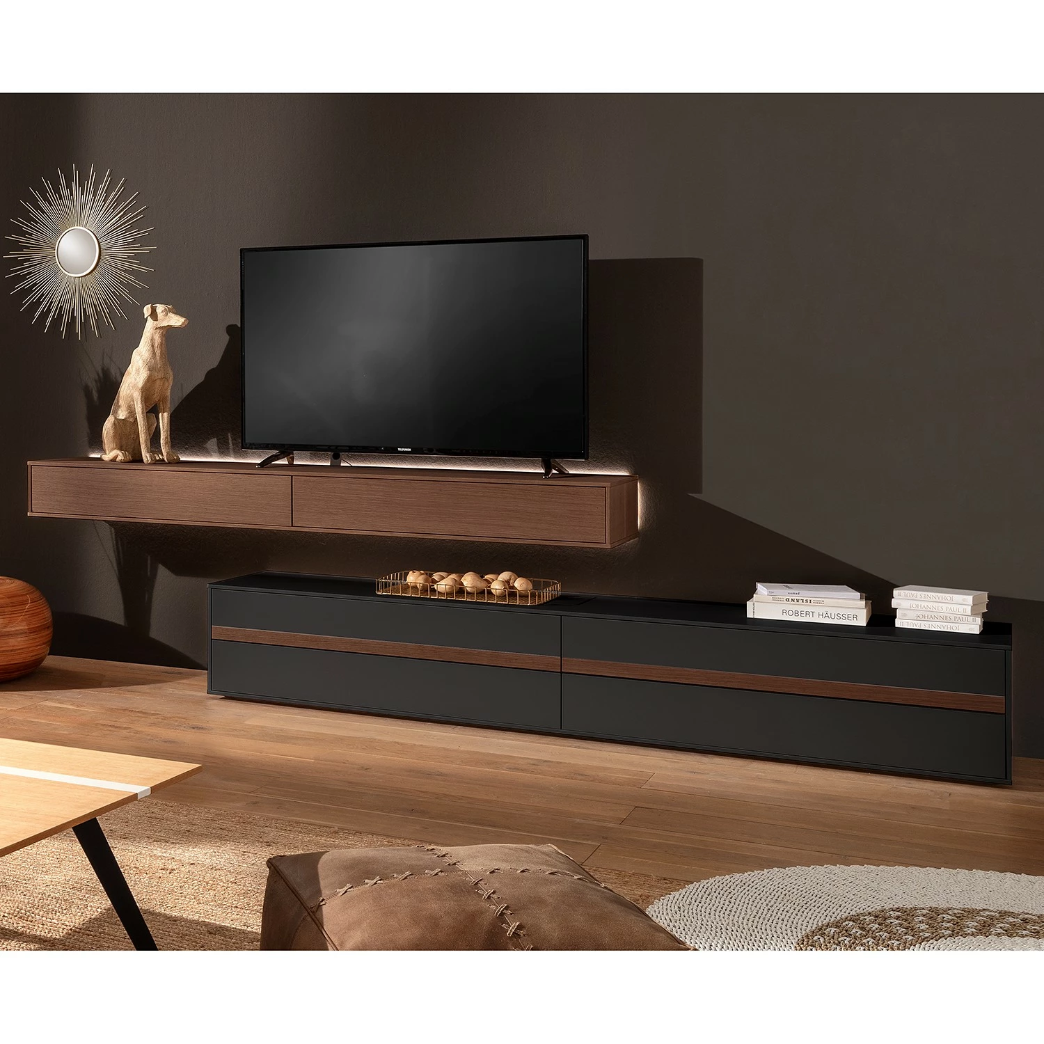 - Lieferumfang: Wohnkombination bestehend aus 1 Lowboard & 1 Hängeschrank inkl. Beleuchtung, ohne Dekoration