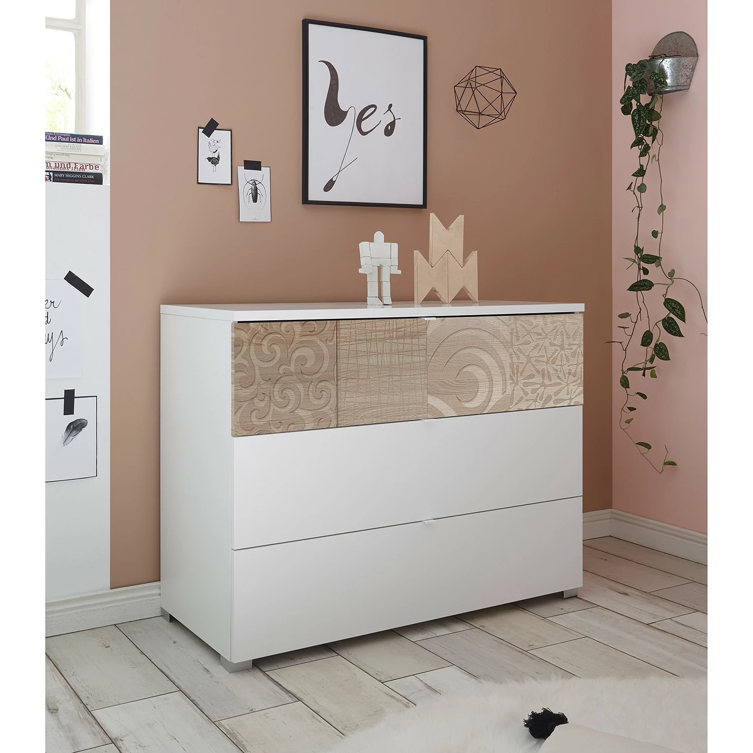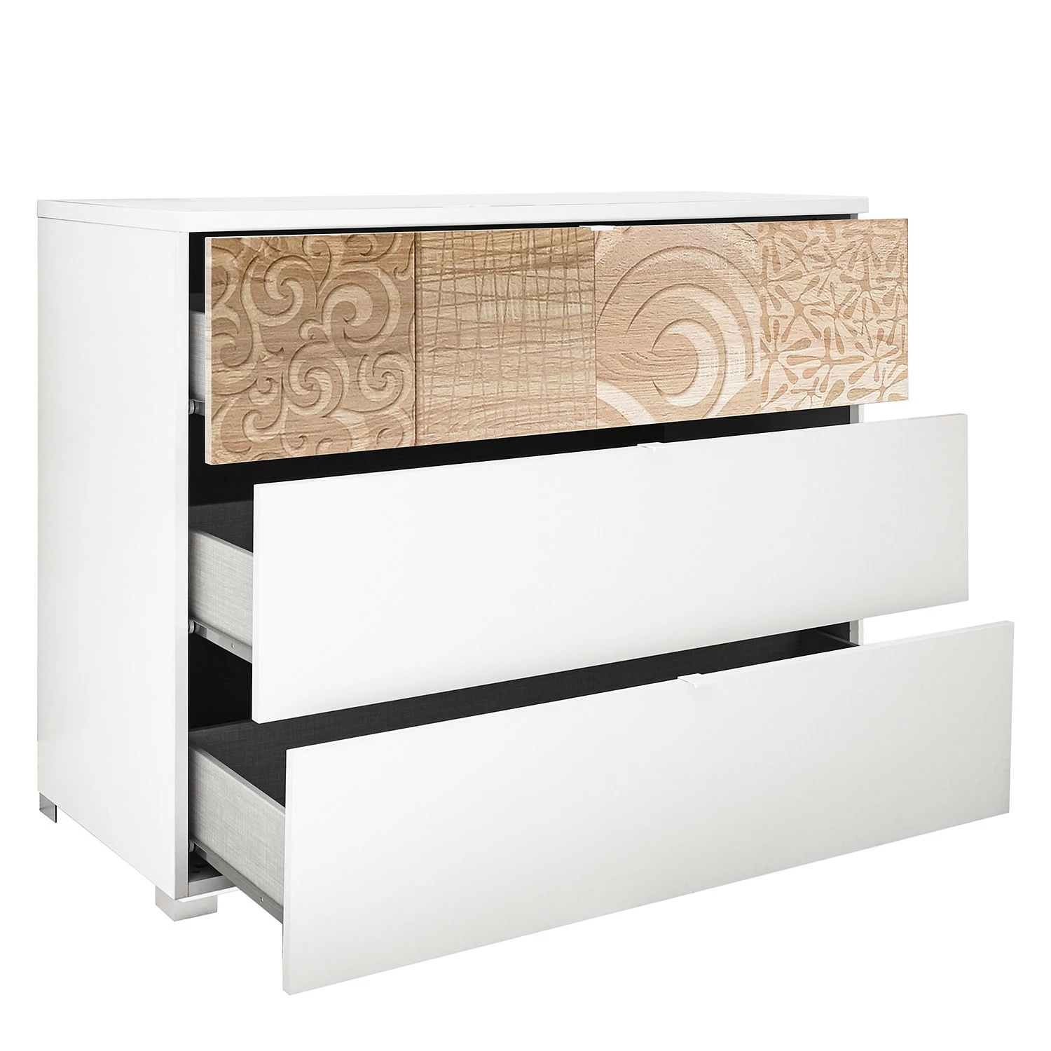 - Weitere Qualitätsmerkmale: obere Schubkastenblende mit Siebdruck; Griffe, Schubkastenschienen, Beschläge aus Metall