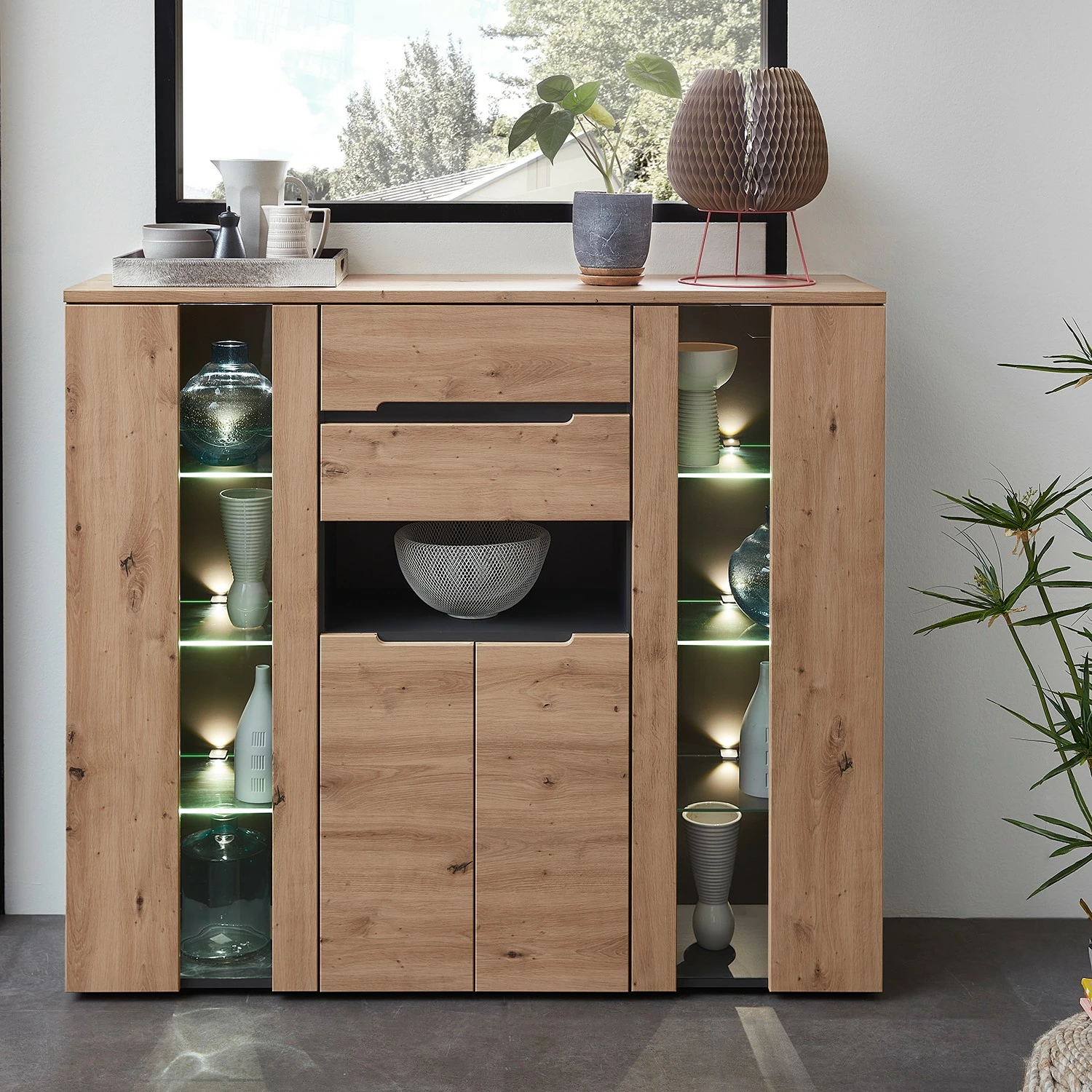 - Lieferumfang: Highboard inkl. Beleuchtung, ohne Dekoration