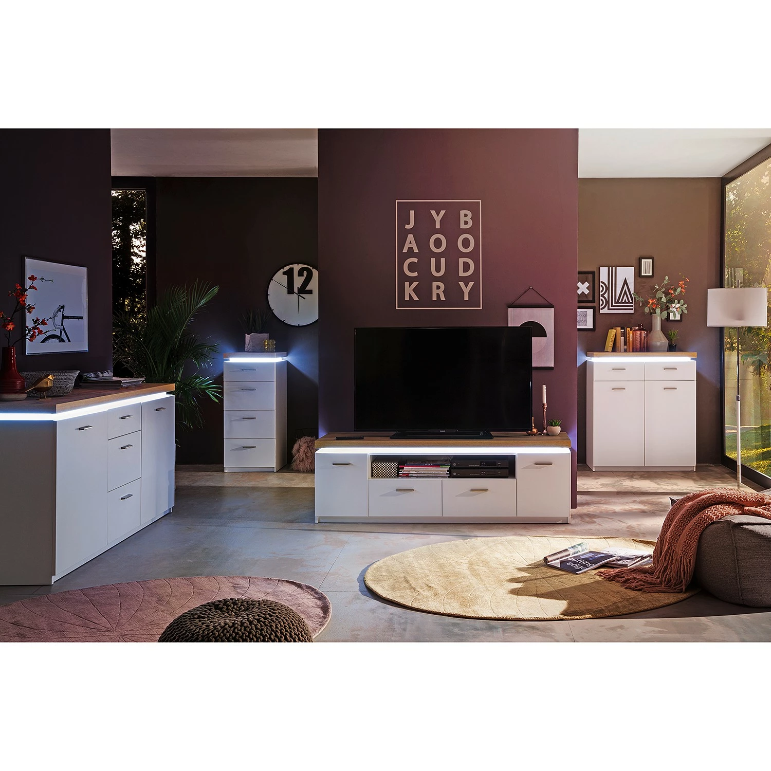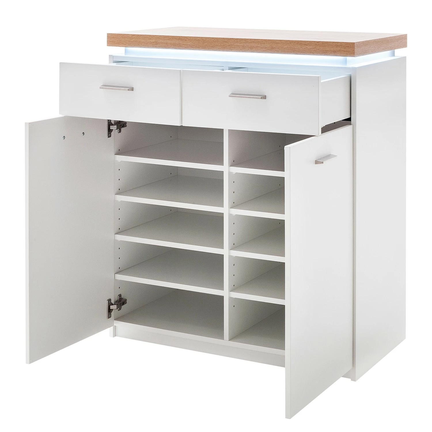 - Lieferumfang: Kommode inkl. Deckplattenbeleuchtung, ohne Dekoration