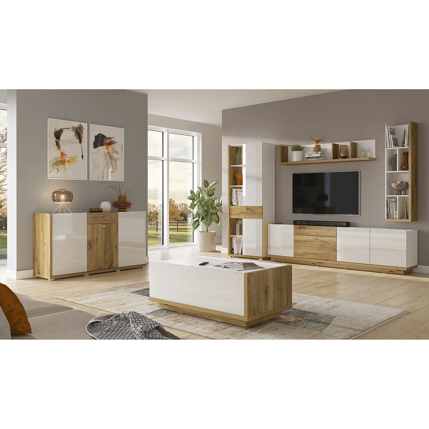 - Front: Hochglanz Weiß / Risseiche Dekor