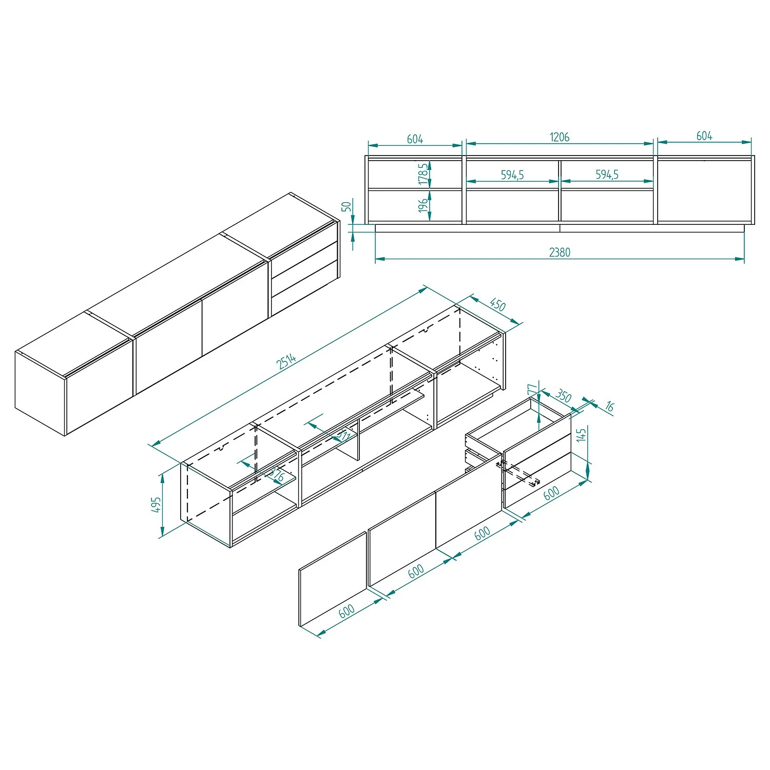 • Lowboard: 250 x 50 x 45 cm