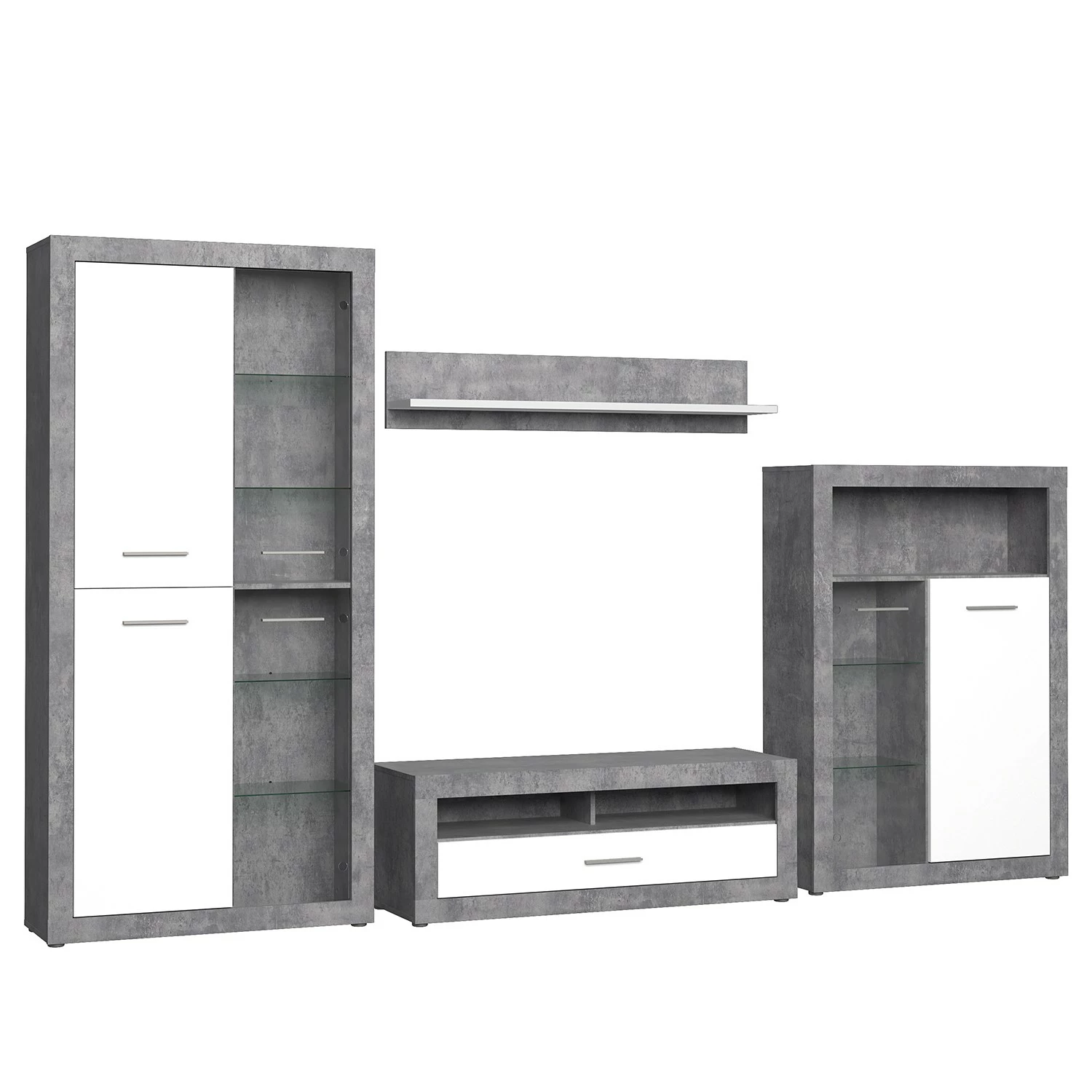 - Lieferumfang: Wohnwand bestehend aus 1 Vitrine, 1 Wandboard, 1 Lowboard & 1 Highboard ohne Beleuchtung & Dekoration