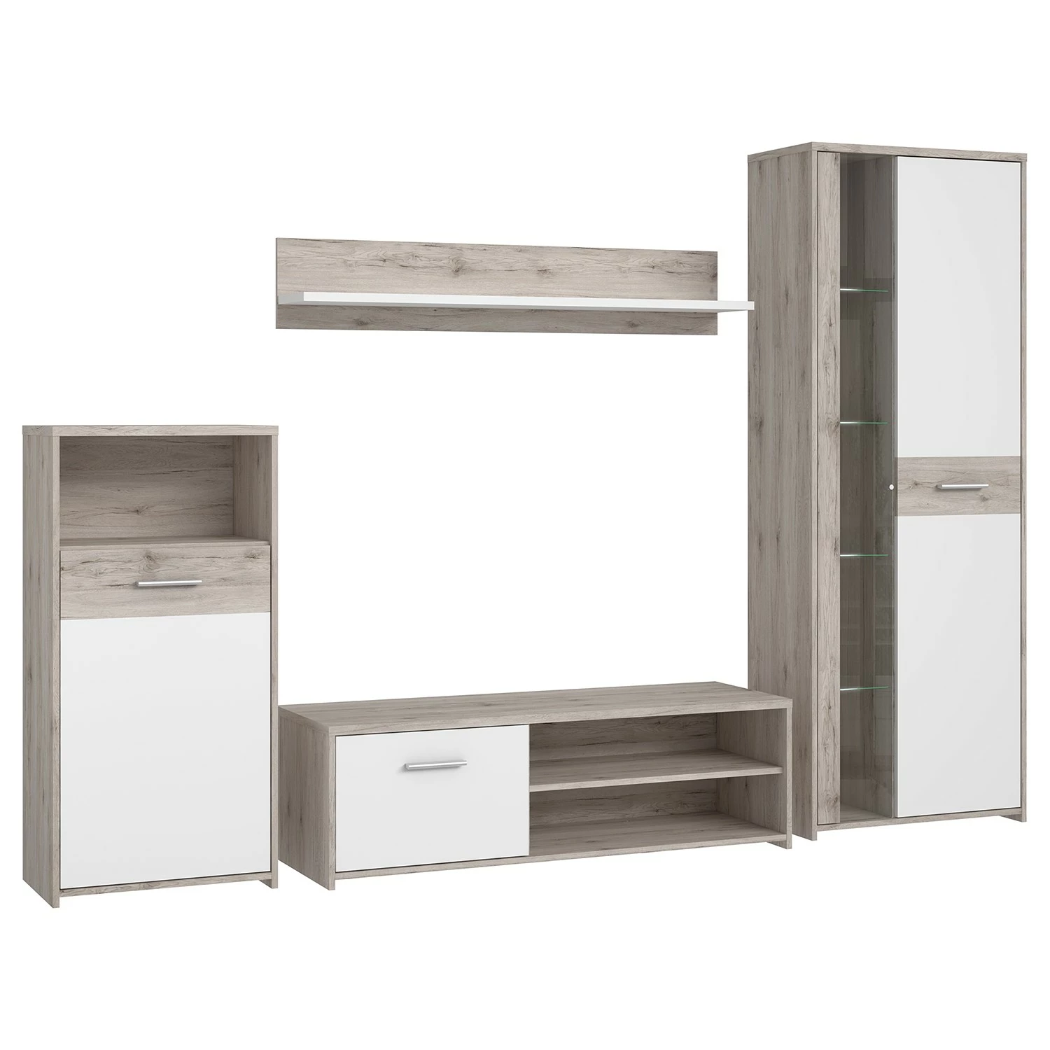 - Lieferumfang: Wohnwand bestehend aus 1 Kommode, 1 Wandboard, 1 Lowboard & 1 Schrank inkl. Beleuchtung, ohne Dekoration