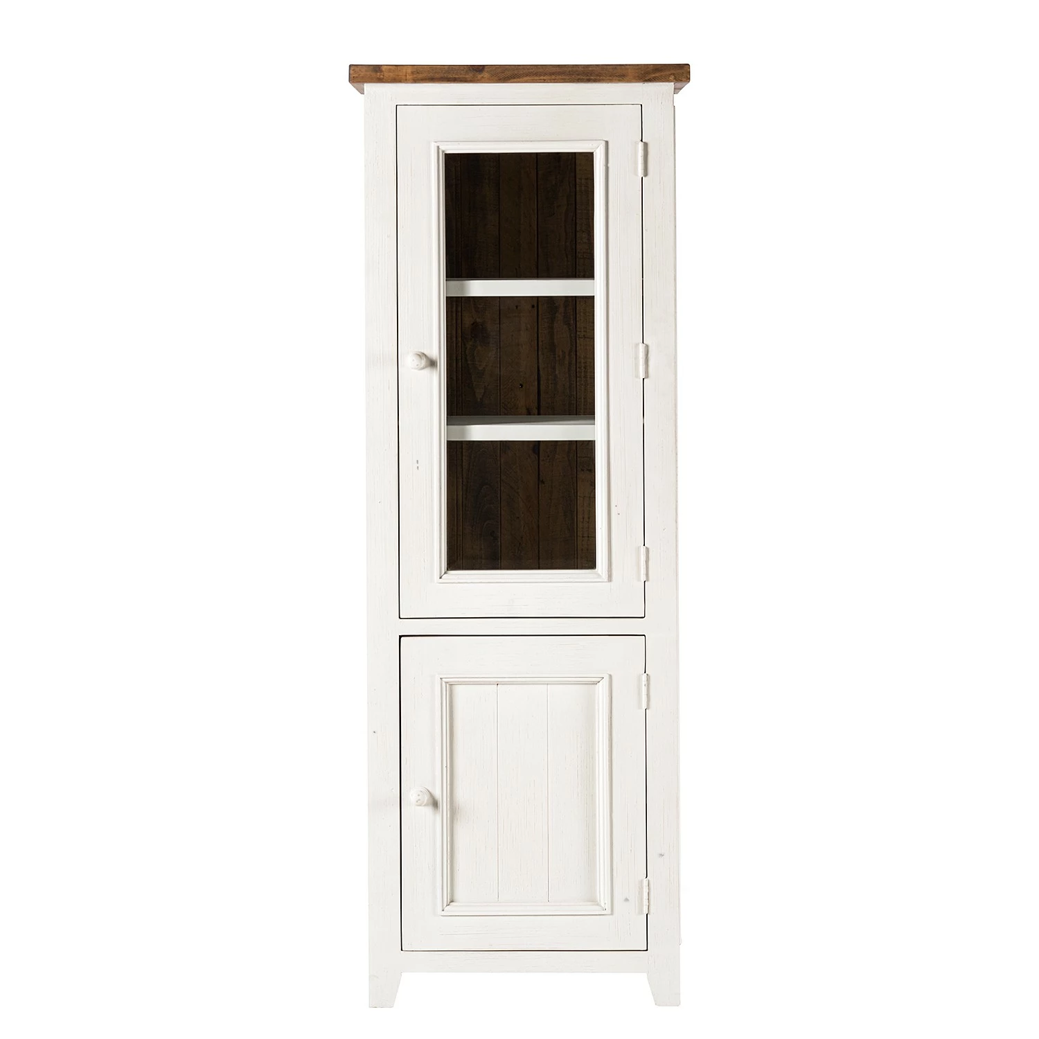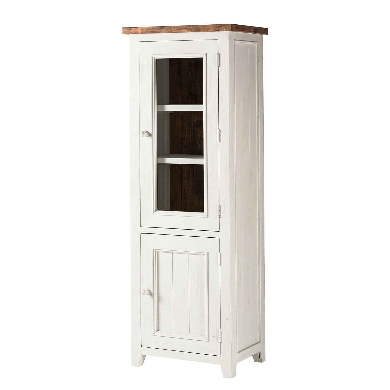 Mit dem hölzernen Design und der zweifarbigen Aufmachung vereint die Standvitrine Balignton I sowohl klassische als auch moderne Elemente. Das Modell ist dank des massiven Kiefernholzes sehr robust und eignet sich ideal, um Geschirr und andere Dinge sorgfältig zu verstauen. Der Vintage-Charme und Landhausstil sorgen für eine gelungene Gesamtoptik. Dank der Glasfront bietet sich die Möglichkeit, Deko-Elemente perfekt in Szene zu setzen. Die Standvitrine Balignton I ist mit einer Holztür inklusive Einlegeboden und einem Fach mit Glastür ausgestattet, hinter der sich zwei weitere Einlegeböden befinden. In zeitgemäß eingerichteten Wohnungen kommt die Vitrine perfekt zur Geltung.