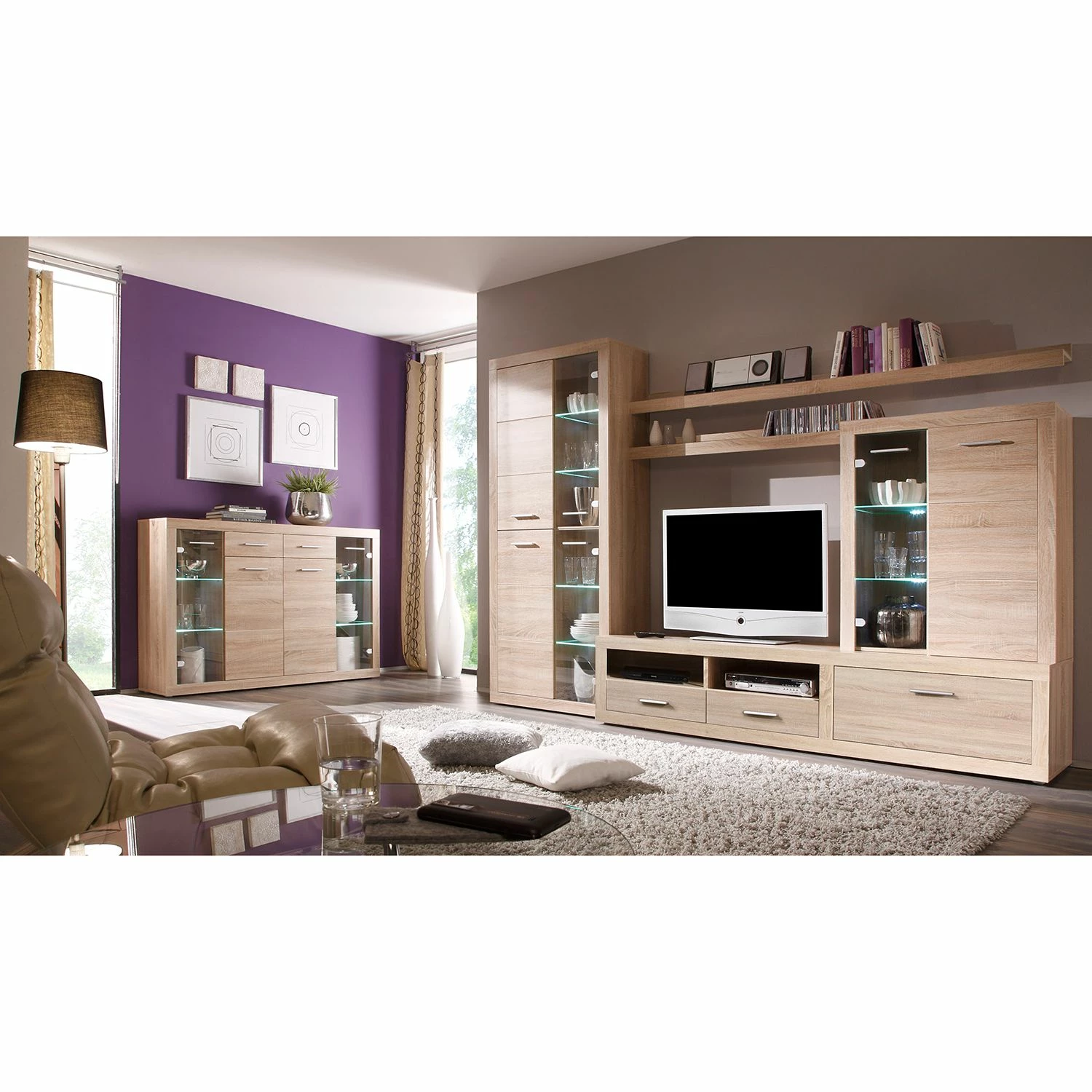 - Lieferumfang: Wohnwand inkl. Beleuchtung, ohne Dekoration