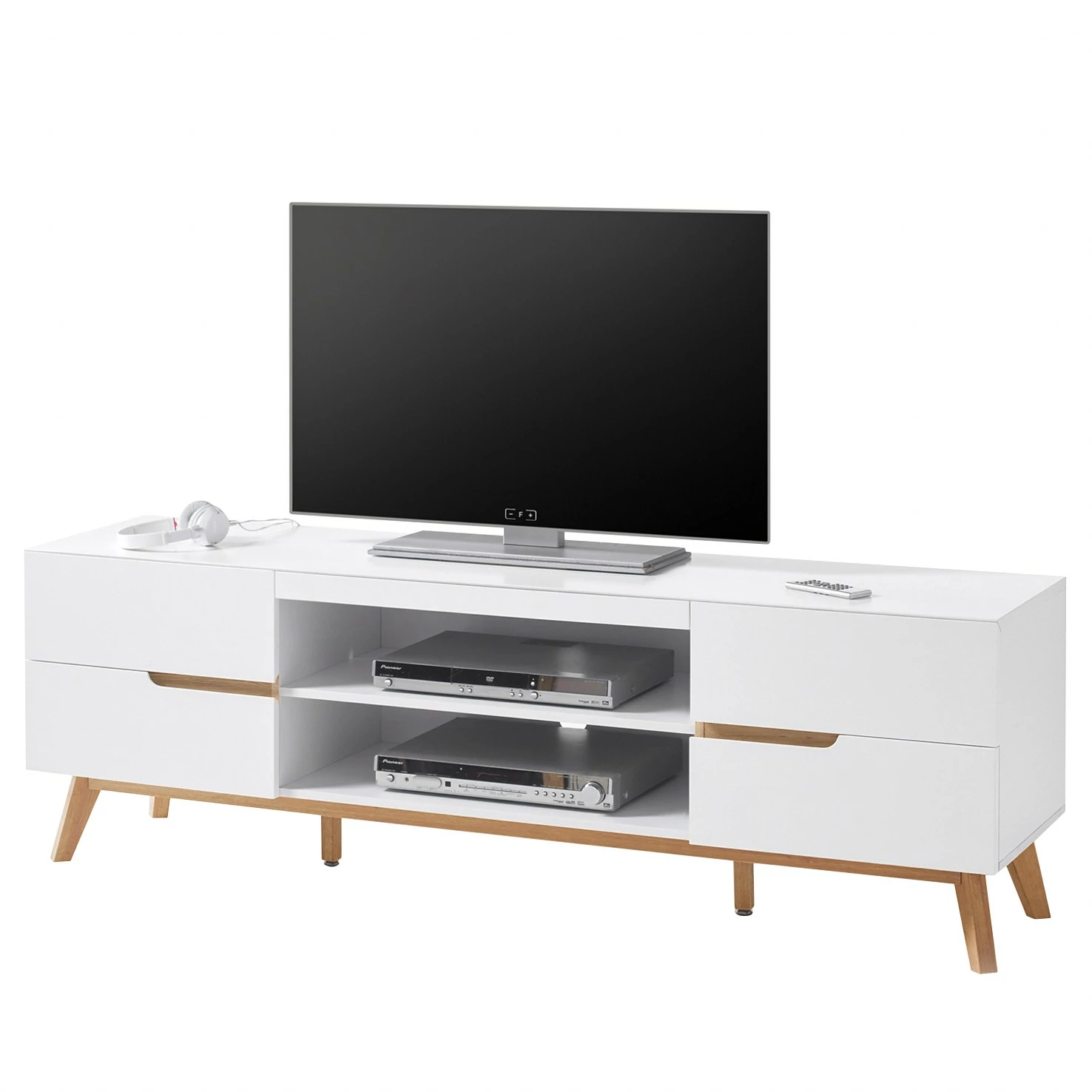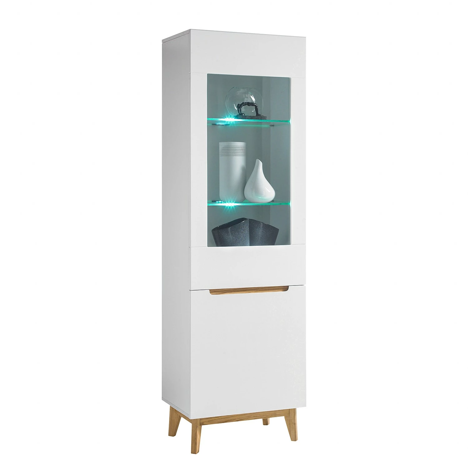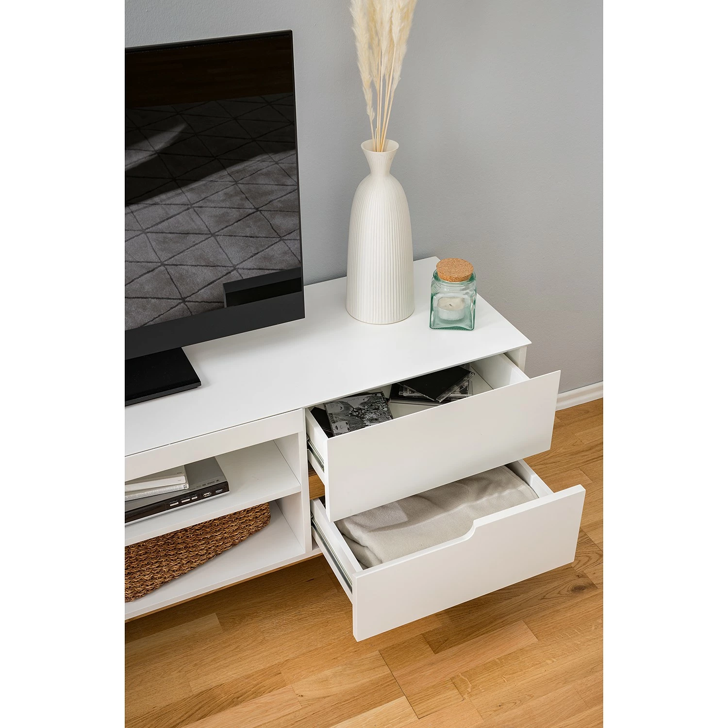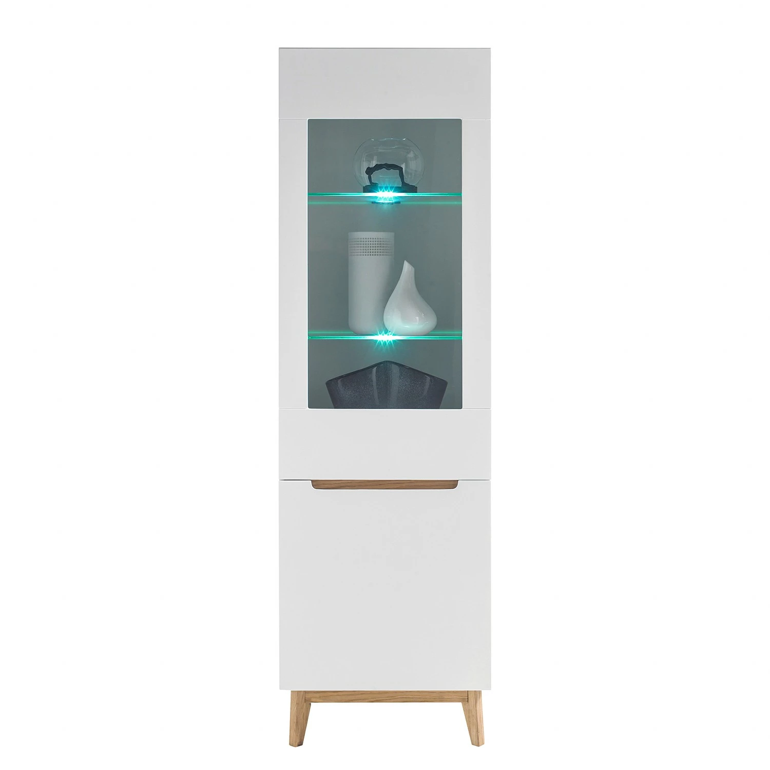 - Lieferumfang: 1 TV-Lowboard, 2 Wandboards & 1 Standvitrine ohne Beleuchtung & Dekoration