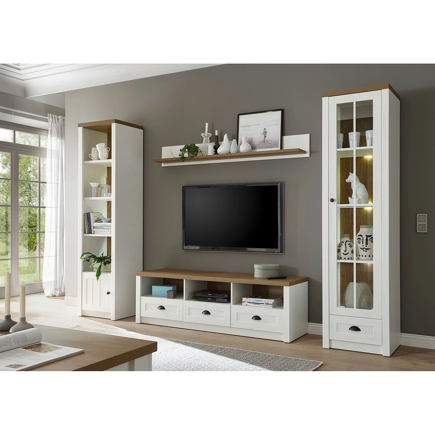 - Lieferumfang: 1 Vitrine, 1 Wandboard, 1 Lowboard & 1 Regal ohne Beleuchtung & Dekoration