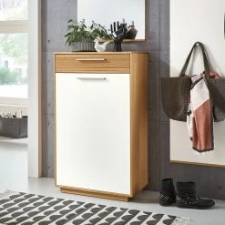 GWINNER Standvitrine Anzio – Matt Weiß / Astnussbaum – Türanschlag links – Mit Beleuchtung