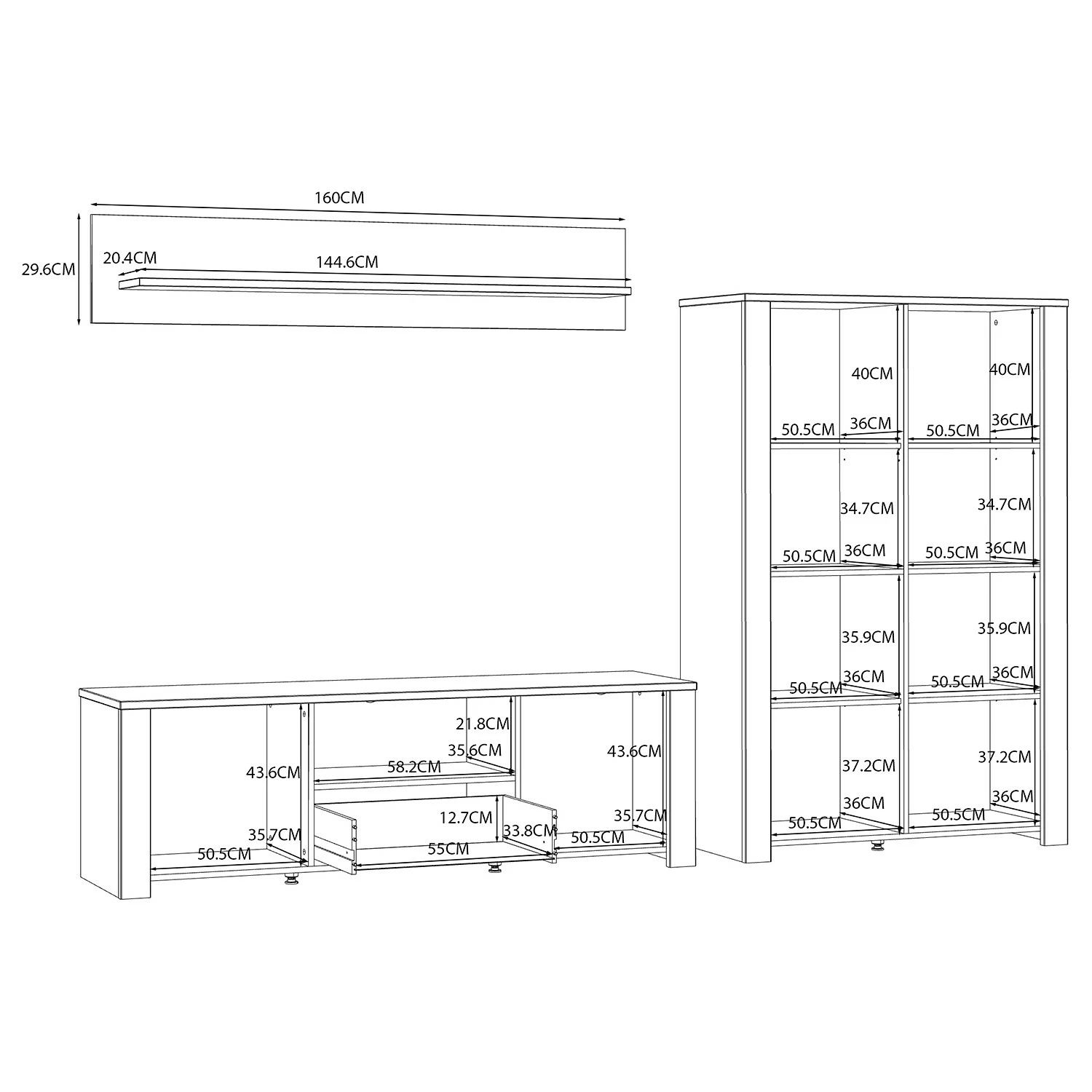 - Wandboard: 160 x 29,6 x 22 cm