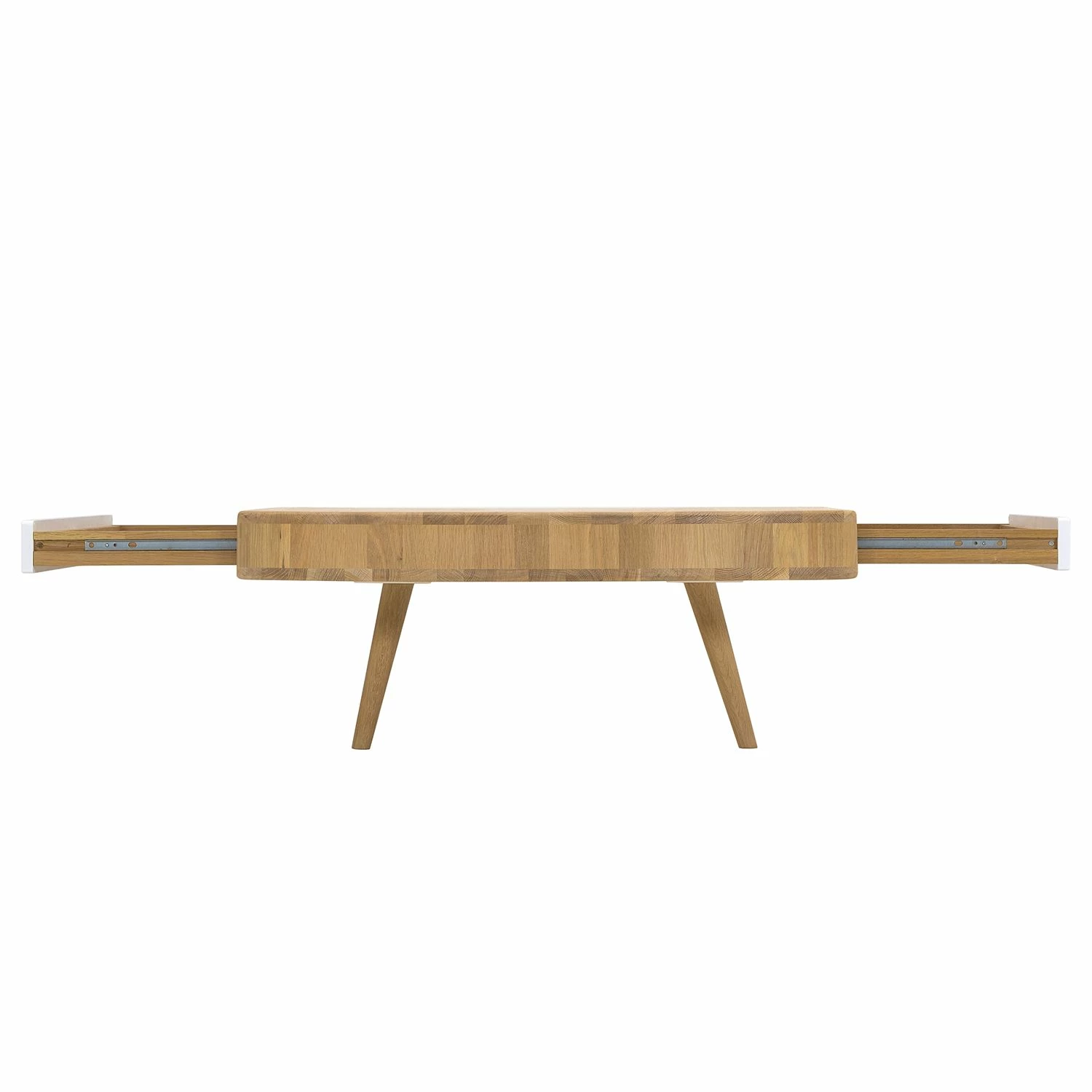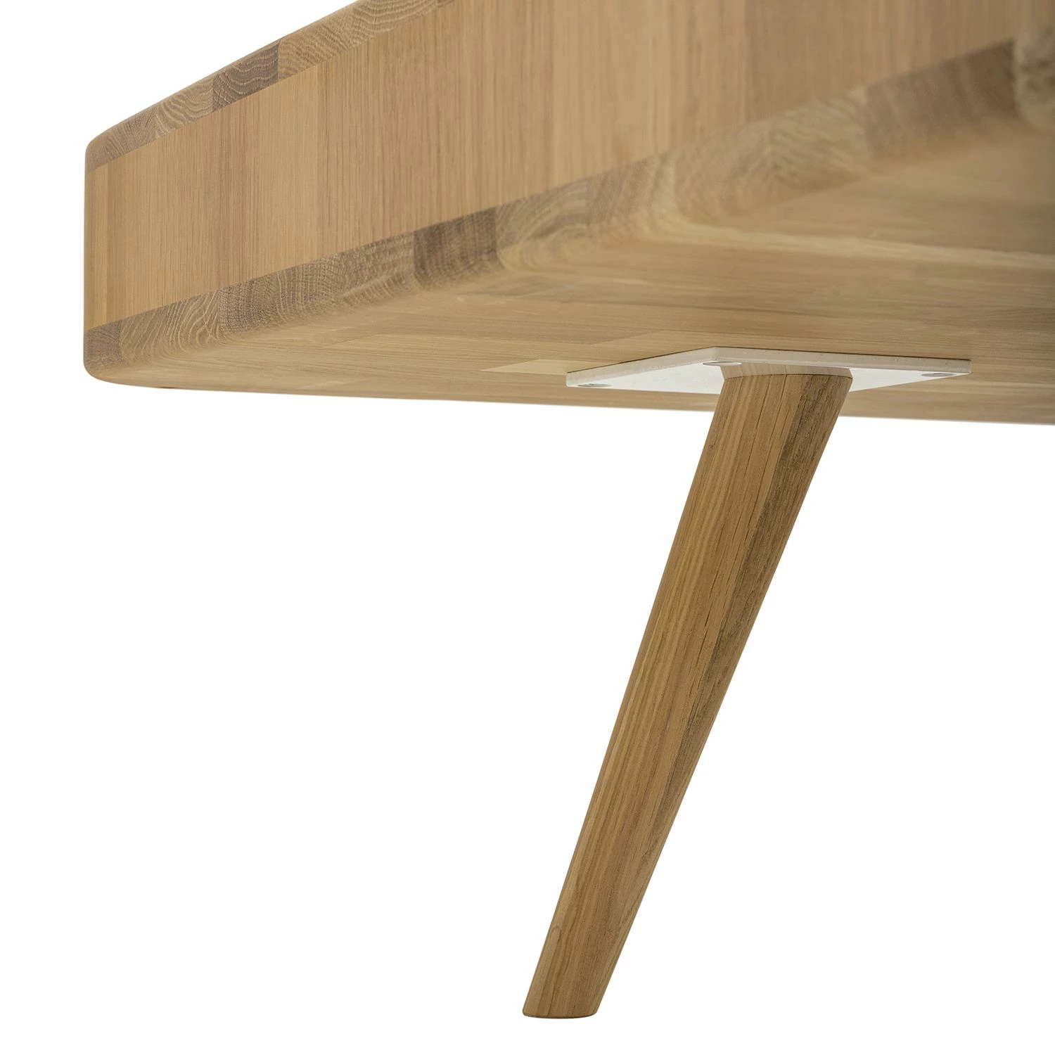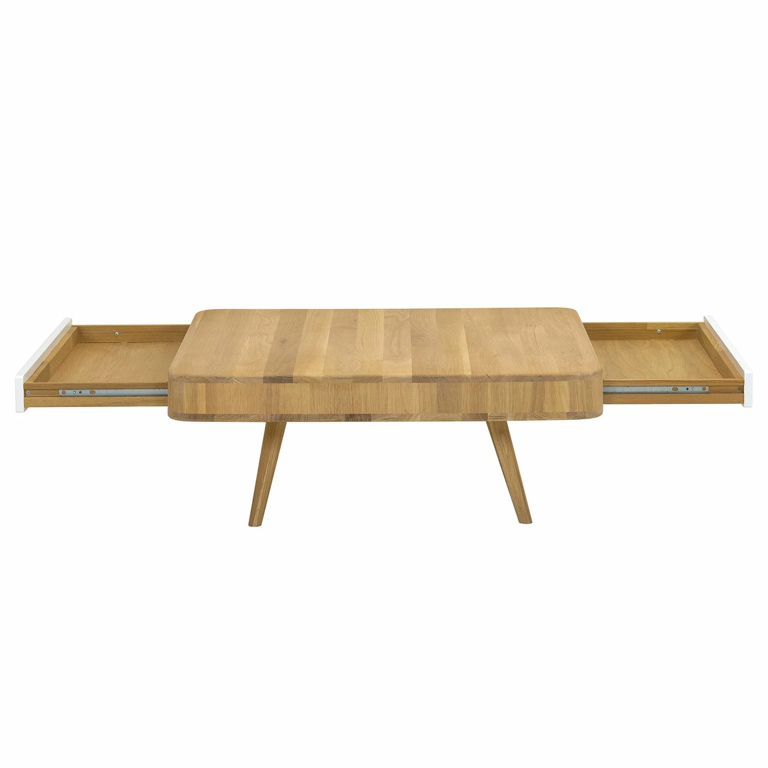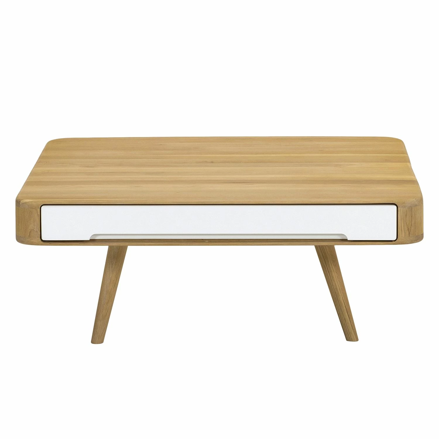 Die quadratische Tischplatte mit den abgerundeten Ecken und die ausgestellten Beine machen den Couchtisch Loca I zu einem besonders eleganten Möbelstück für moderne Wohnräume. Neben seinem edlen Erscheinungsbild im skandinavischen Retro-Design besticht der Couchtisch Loca I auch durch seine hochwertigen Materialien: Sowohl der Korpus als auch die sich nach unten verjüngenden Füße wurden aus massiver, gebeizter und geölter Wildeiche gefertigt. Die beiden praktischen Schubladen sorgen nicht nur für Stauraum: Dank ihrer farblich abgesetzten Fronten aus MDF-Platten verleihen sie dem Couchtisch Loca I ein besonders frisches Aussehen.