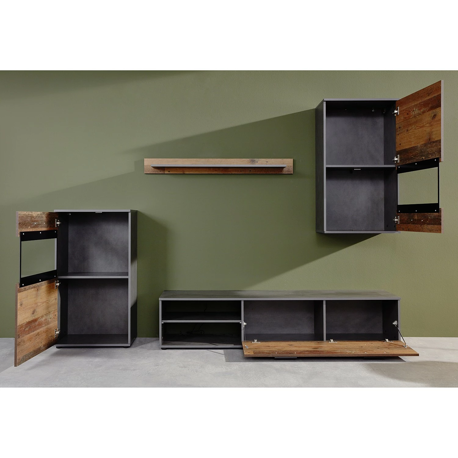 - Lieferumfang: Wohnwand bestehend aus 1 Hängevitrine, 1 Lowboard, 1 Wandboard & 1 Kommode ohne Beleuchtung & Dekoration