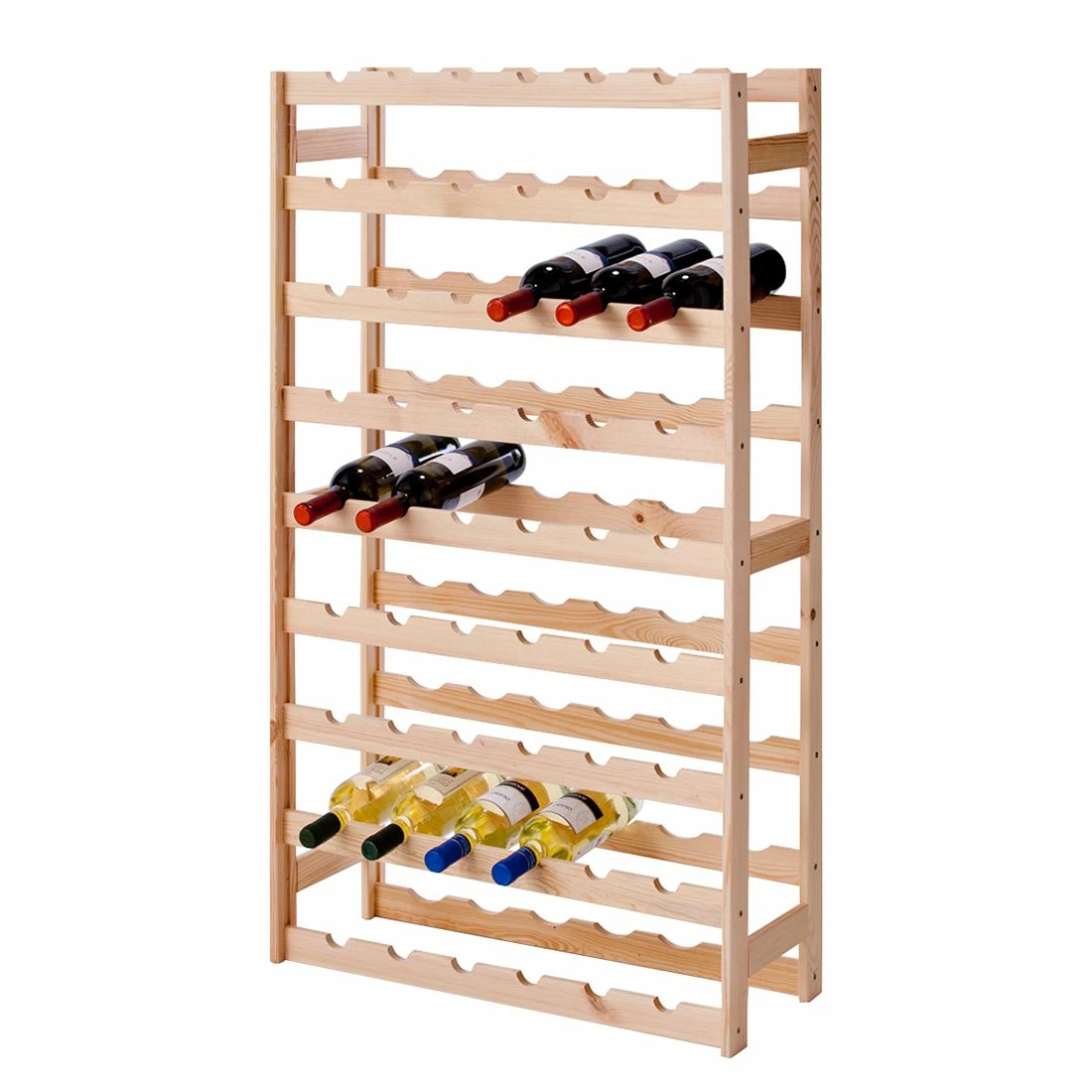 Dank des Massivholzes in Kombination mit der gut durchdachten Konstruktion bietet Dir das Regal für insgesamt 54 Flaschen Platz, ohne dass Du dir um die Stabilität sorgen machen musst. Setze mit diesem Weinregal im minimalistischen Designkonzept ein Statement in Deinem Zuhause.